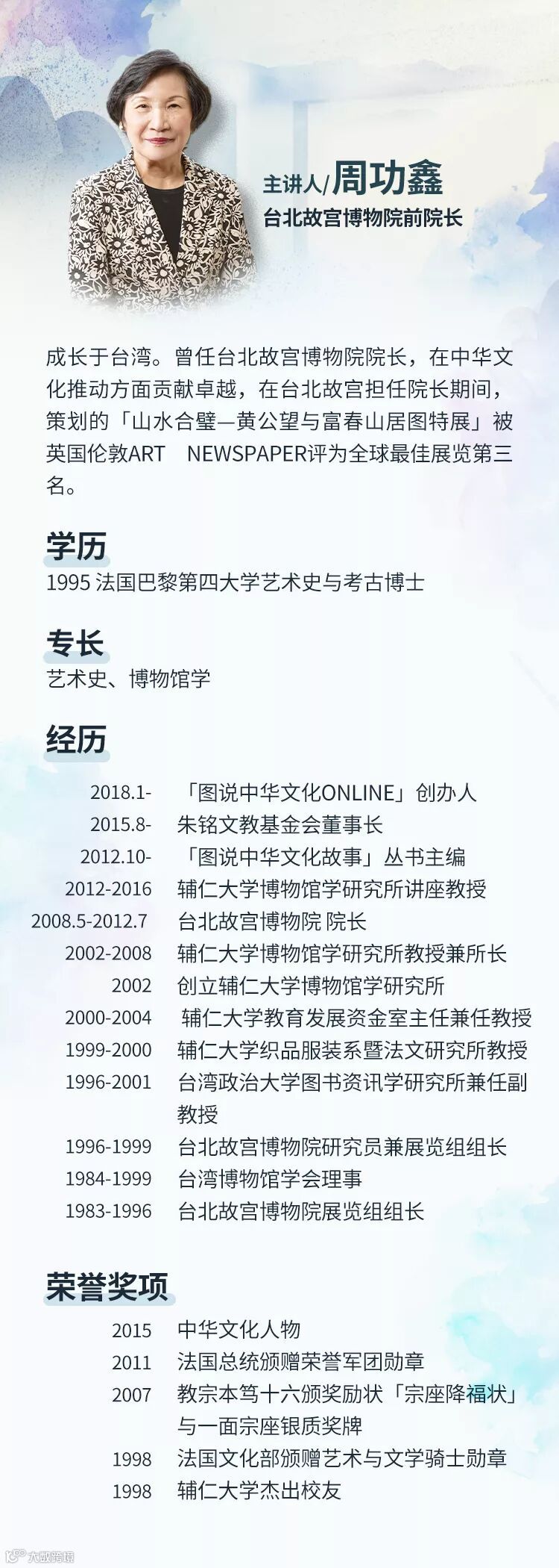 --周功鑫(前台北故宫博物院院长),曾在台北故宫工作了31年,她认为,从故宫精美丰富的藏品习得中华文化,认识中国艺术,提升我们的素质,那将是故宫的最大魅力,也是故宫存在的最高的价值。