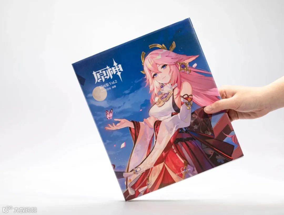 《原神插画集Vol.2》延续《原神插画集Vol.1》的尺寸,在外盒上定制了pvc盒套,保护书籍的同时也提升了整体收藏质感。腰封选用 150g 艺术超感纸进行满版印刷,作为内容简介。