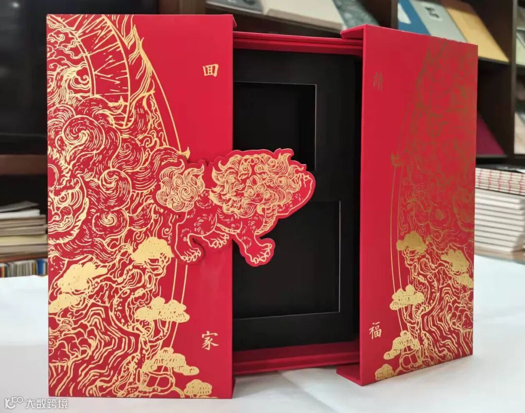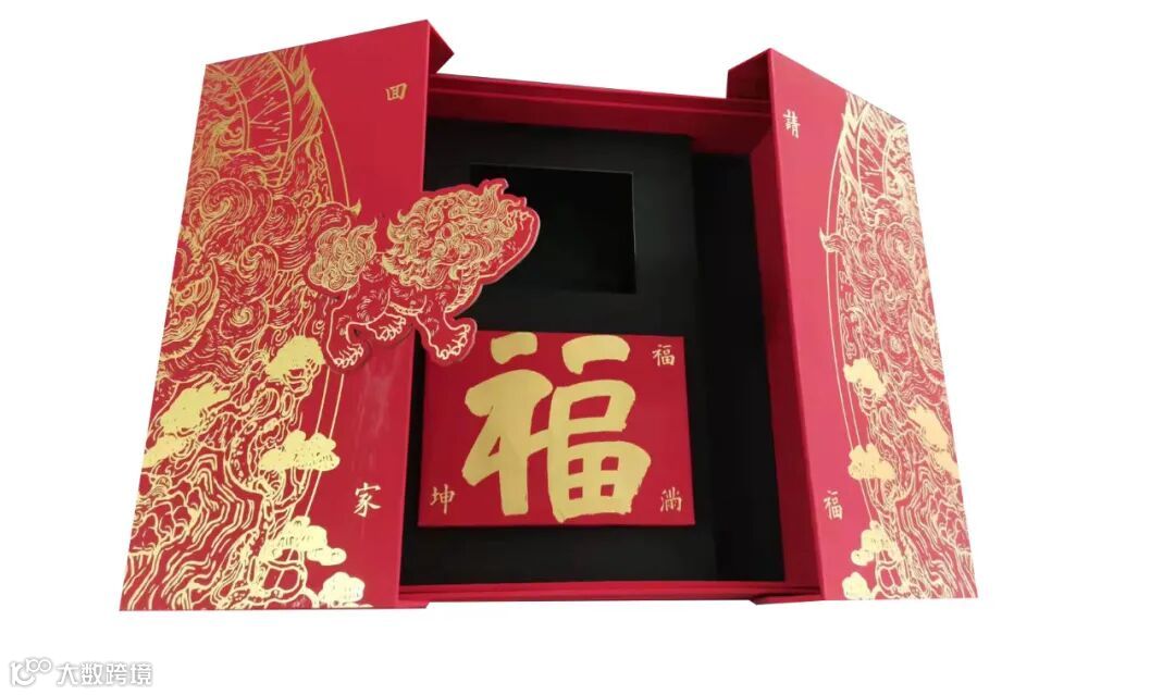 除了内嵌盒用低调的黑卡作色彩对冲处理外,礼盒的正面、内里都只采用了红、金两色,纯正的中国红纸面上烫上亮金色,麒麟神兽图案,浓浓的国潮风!
