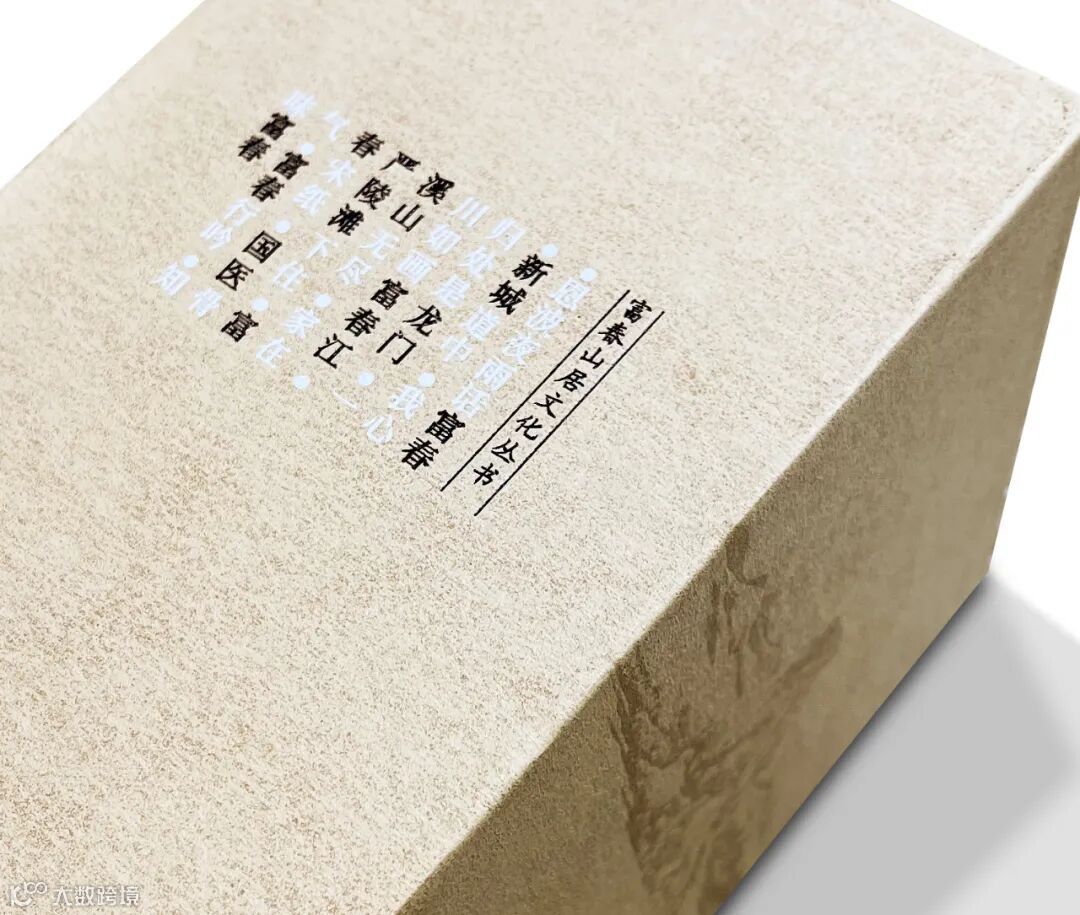 这部丛书函套选用116g 亚麻色草木纸结合烫印工艺。亚麻色草木纸文雅内敛,肌理细腻、自然起伏,将黄公望的富春山居图印刷之上,古韵十足,触手有种岁月留痕之感。
