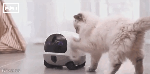 可是这个隔空撸猫神技的背后到底是有什么样的特殊装置在做支撑呢?广大撸猫群众纷纷通过各种渠道打探,甚至有不少小伙伴前往赛果合作猫咖猫舍一探究竟。这才破解了秘密——原来赛果在每个合作猫咖猫舍都配备了一个外观萌萌哒的机器人。