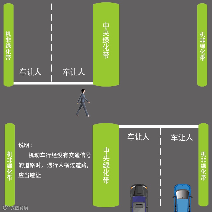 行人步入斑马线,第③车道车辆必须让行,行人开始通过斑马线,所在车道车辆和下一车道车辆必须让行,行人到达中央绿化隔离带或双黄线,下一车道车辆必须让行。
