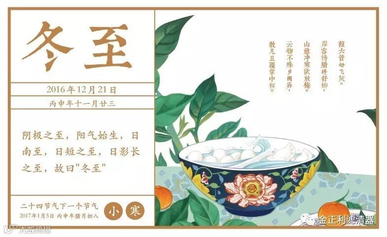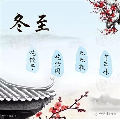 据记载,周秦时代以冬十一月为正月,以冬至为岁首过新年。《汉书》有云:"冬至阳气起,君道长,故贺……"也就是说,人们最初过冬至节是为了庆祝新的一年的到来。古人认为自冬至起,天地阳气开始兴作渐强,代表下一个循环开始,是大吉之日。因此,后来一般春节期间的祭祖、家庭聚餐等习俗,也往往出现在冬至。冬至又被称为"小年",一是说明年关将近,余日不多;二是表示冬至的重要性。