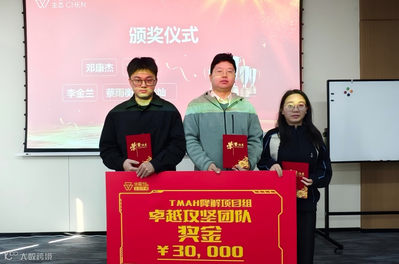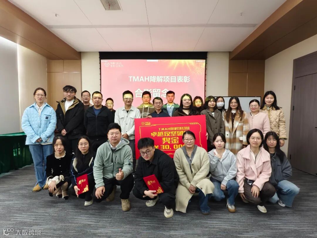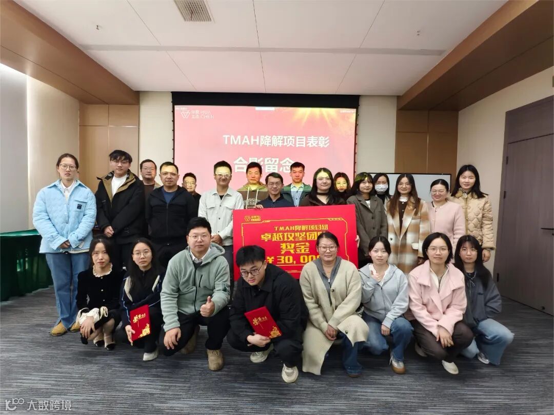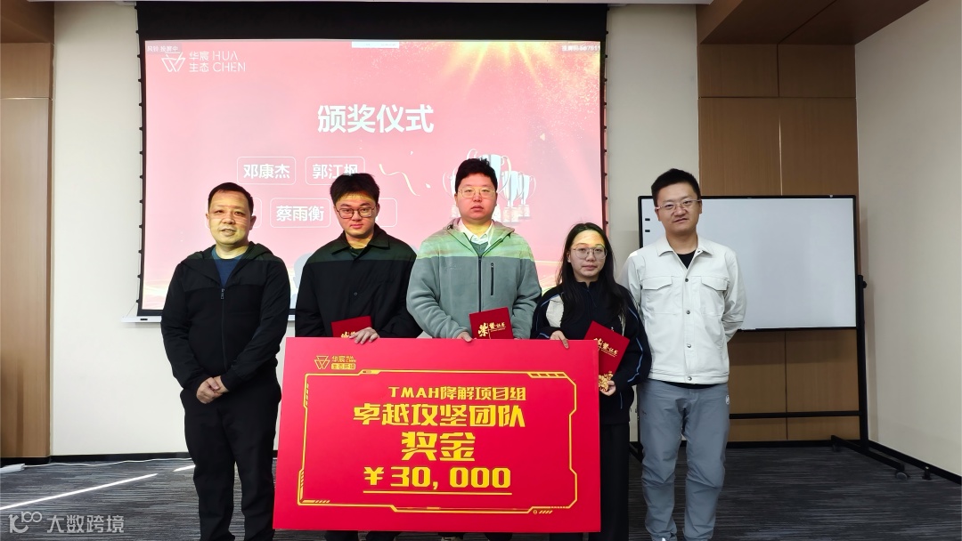 随后的颁奖环节将大会推向高潮。谭总与程教授共同为TMAH降解项目组颁发荣誉奖状及团队奖金人民币30,000元,表彰六位核心成员在四个月攻坚期内的突出贡献。这一荣誉不仅是对他们夜以继日奋战的肯定,更是对华宸生态“科技驱动环保”理念的生动诠释。
