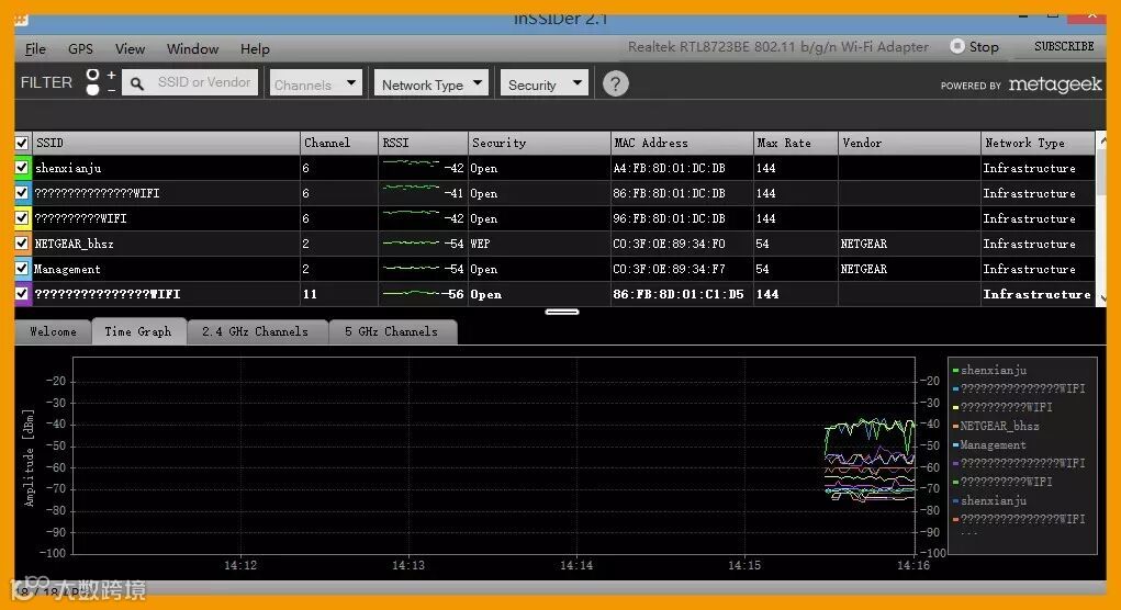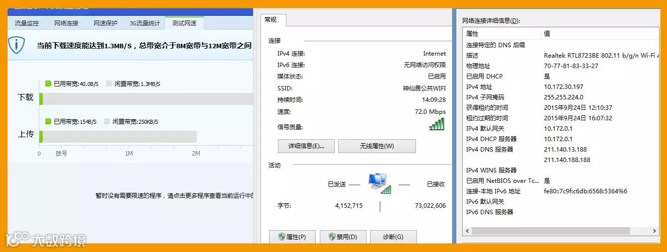 神仙居WLAN项目启用后,受到游客的广泛赞誉!现场网速测试以及信息扫描图。