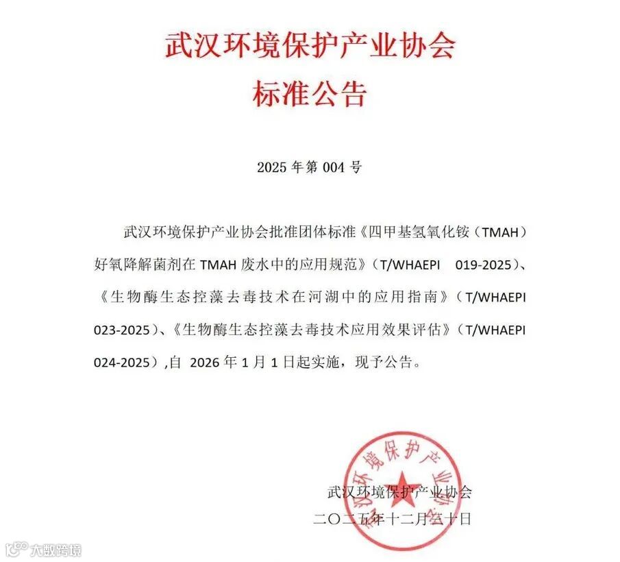 近日,由湖北华宸生态环境有限公司(以下简称“湖北华宸”)拟定的《四甲基氢氧化铵(TMAH)好氧降解菌剂在TMAH废水中的应用规范》(T/WHAEPI 019-2025)团体标准于武汉环境保护产业协会正式发布。