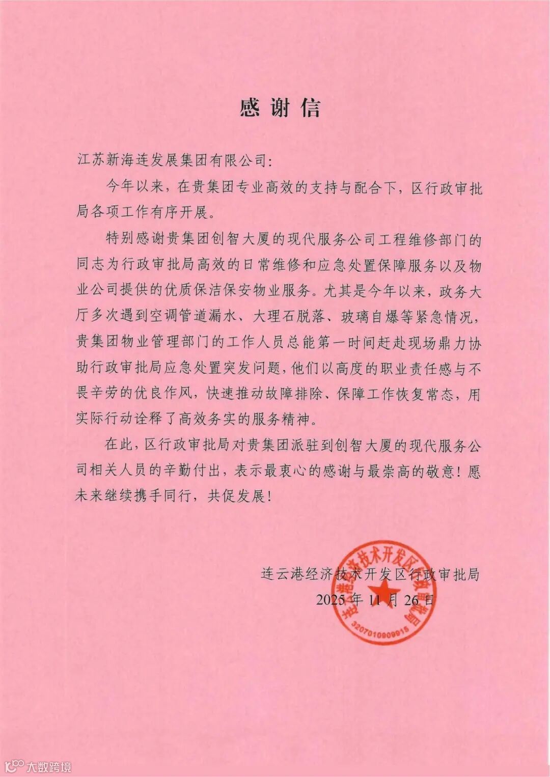 近日,连云港经济技术开发区行政审批局致信新海连集团,特别向旗下现代服务公司送上诚挚感谢,高度评价其在政务服务保障中的“硬核担当”与“暖心服务”。