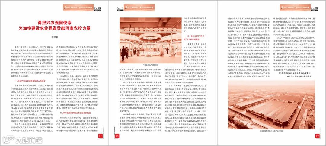 党的二十届四中全会提出,“十五五”时期要加快农业农村现代化,扎实推进乡村全面振兴,加快建设农业强国。省委十一届十次全会把农业强省放在加快建设“六个强省”的首位,充分体现河南农业大省胸怀国之大者的责任担当。河南农业投资集团有限公司(以下简称“河南农投集团”)深入学习贯彻党的二十届四中全会精神和省委十一届十次全会精神,着力打造国内一流农业投资集团,全力服务农业强省建设,为奋力谱写中原大地推进中国式现代化新篇章提供有力支撑。