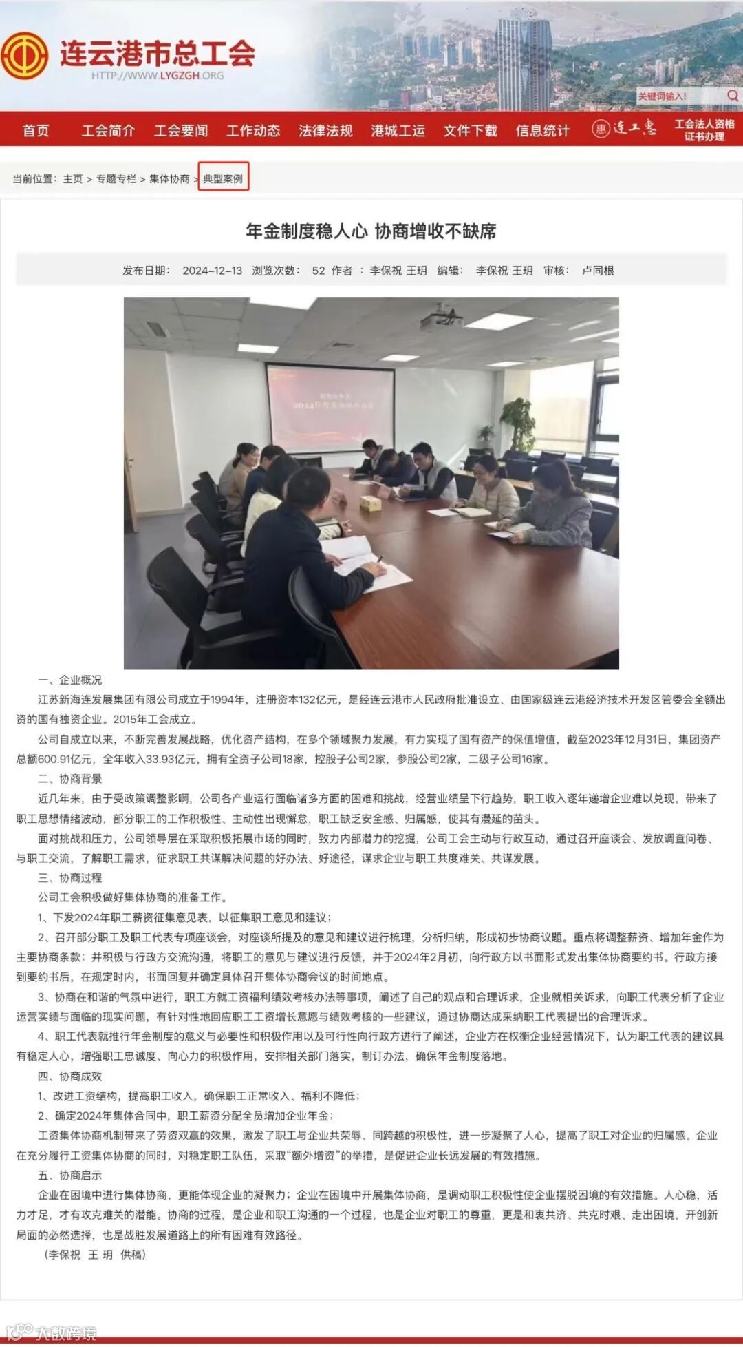 新海连集团工会在集团党委领导下,积极谋划,认真落实,规范开展了集体协商、职工代表大会、职工慰问等系列工作,充分发挥了保障职工权益、激活发展动力等作用。其中,集体协商工作被市总工会作为典型案例进行宣传推广,此次典型案例的选定,标志着市总工会对新海连集团工会工作的充分认可与高度肯定。
