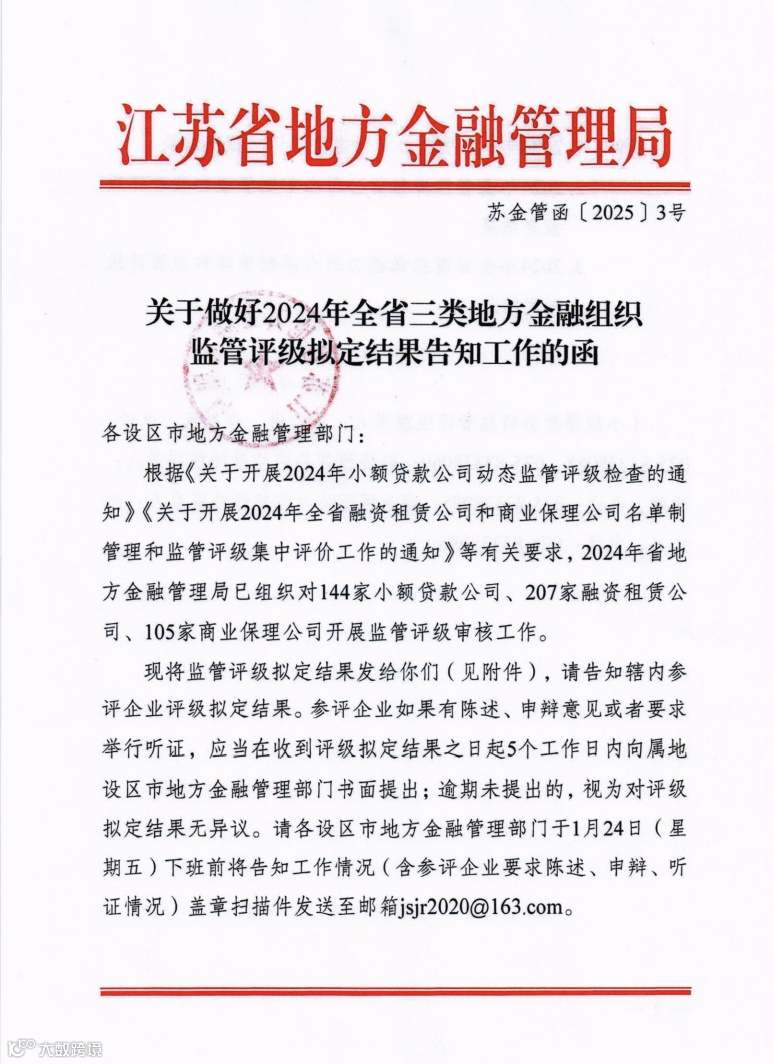 近日,江苏省地方金融管理局公布小额贷款公司及商业保理公司的监管评级结果,科贷公司和保理公司在2024年动态监管评级检查中均荣获最高评级“A”级。标志着两家公司拥有健全的治理体系,突出的风险管理能力和强劲的持续发展潜力,以及对两家公司在合规运营、风险管理等方面的高度认可。