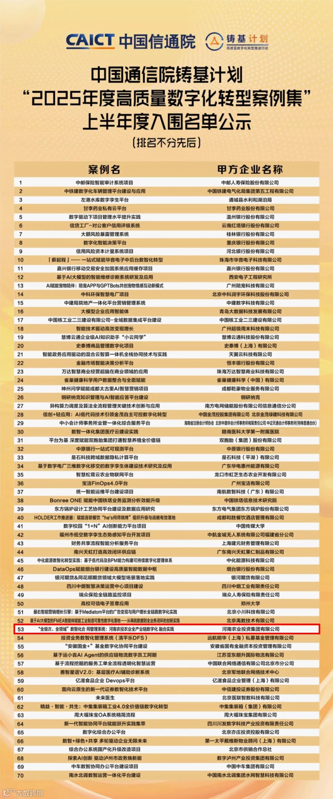 本次大会汇聚政产学研各界,以“洞见十五五”为主题,研讨未来五年数字经济高质量发展之路。“铸基计划”是由中国信通院于2021年发起的高质量数字化转型专项行动,旨在从全国遴选具有创新性和实效性的数字化转型案例,集中展示国内数字化转型领域具有突出市场表现和商业价值的企业,为各行各业数字化转型高质量发展提供示范引领和路径参考。本次入围的案例共计70件,其中河南省共有河南农投集团、中原银行、郑州大学等3家单位上报的案例入选,这不仅是对集团数智化合同管理系统实践经验的充分肯定,更是对集团数字化转型创新成果的高度认可。