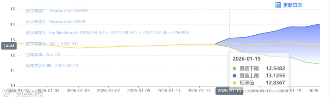玄田算法是由项目课题组团队原创的非经典逻辑数值聚合理论和不确定性预测方法,构建了基于一致模算子的生猪价格预测模型。该模型采用的聚合函数及一致模相关理论与方法已获得多项国家自然科学基金和省级自然科学资金资助,并获得多项省级自然科学奖奖项。01月15日预测猪价为12.7305,置信区间在12.2414--13.2327之间。01月16日预测猪价为12.7103;01月17日预测猪价为12.7681。