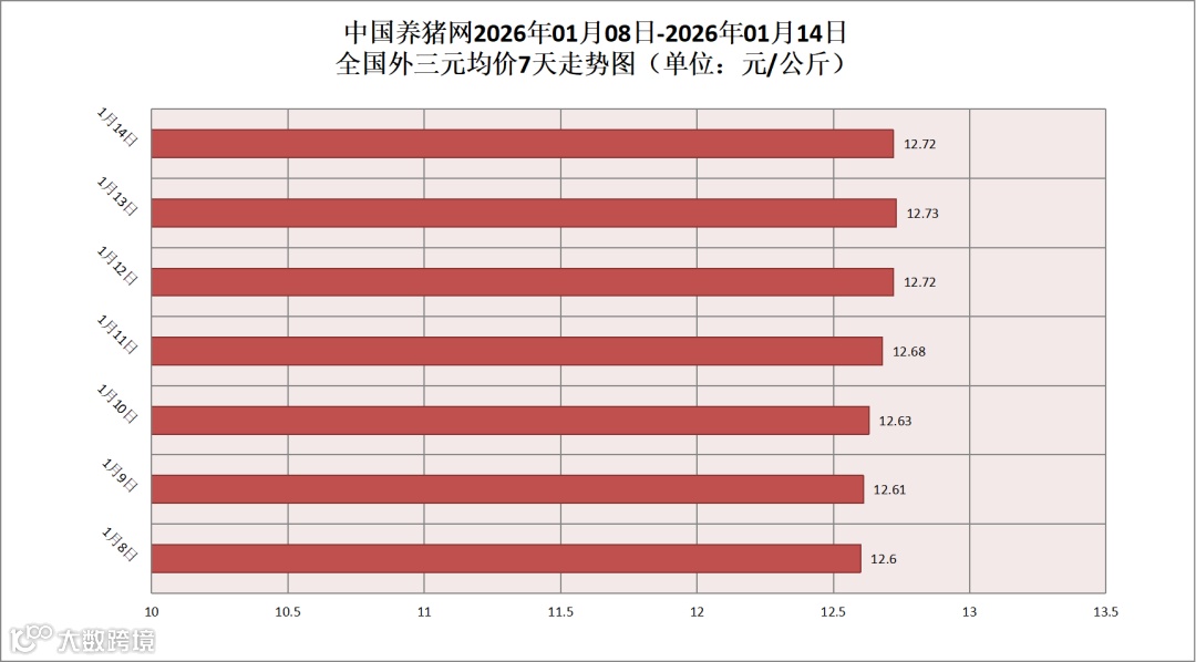 2026年01月14日(星期二),据中国养猪网猪价系统监测,全国外三元均价为12.72元/公斤,猪价较昨日(12.73元/公斤)下跌0.01元/公斤,较上月(11.56元/公斤)上涨了1.16元/公斤。