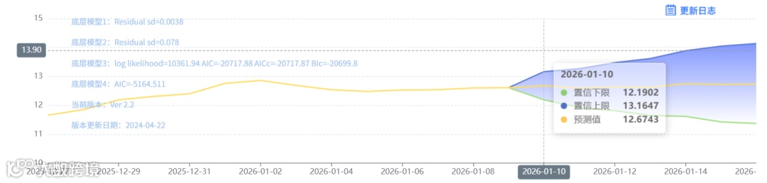 玄田算法是由项目课题组团队原创的非经典逻辑数值聚合理论和不确定性预测方法,构建了基于一致模算子的生猪价格预测模型。该模型采用的聚合函数及一致模相关理论与方法已获得多项国家自然科学基金和省级自然科学资金资助,并获得多项省级自然科学奖奖项。01月10日预测猪价为12.6743,置信区间在12.1902--13.1647之间。01月11日预测猪价为12.5939;01月12日预测猪价为12.6385。