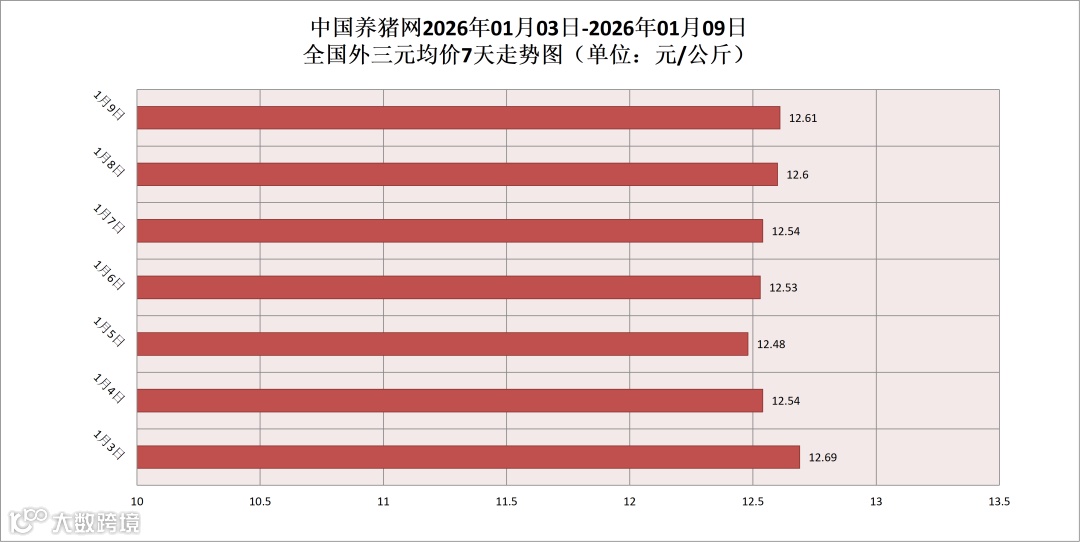2026年01月09日(星期五),据中国养猪网猪价系统监测,全国外三元均价为12.61元/公斤,猪价较昨日(12.60元/公斤)上涨0.01元/公斤,较上月(11.32元/公斤)上涨了1.29元/公斤。