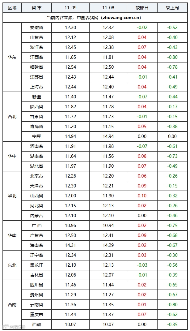省、四川省、山东省、山西省、广西壮族自治区;上涨区间:0.01-0.10元/公斤;