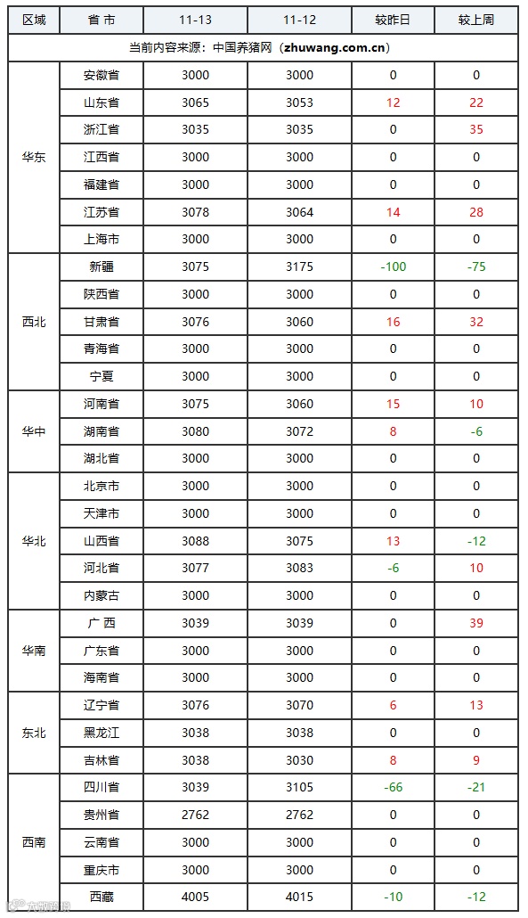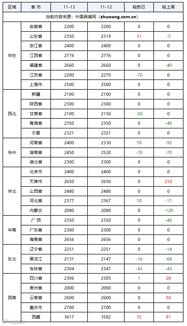 猪价上涨地区(3个):山东省、海南省、黑龙江省;上涨区间:0.01-0.12元/公斤;