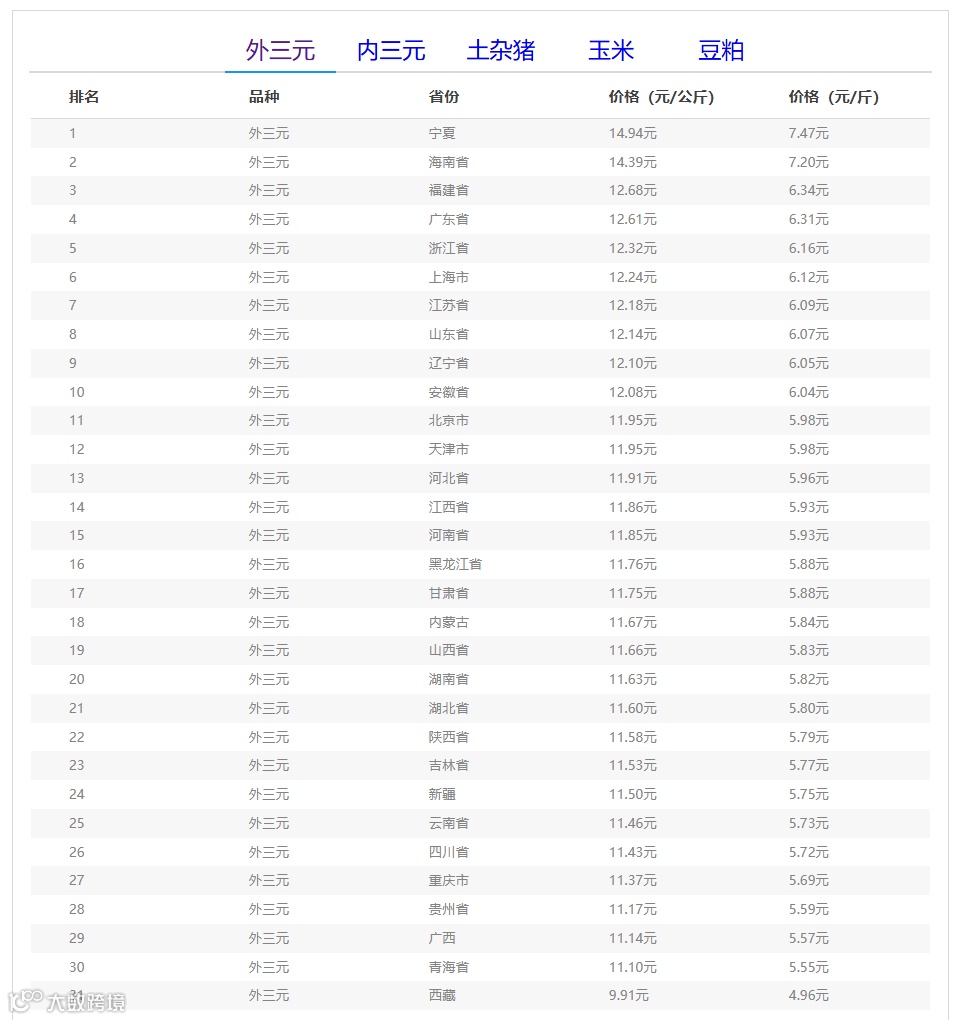 外三元排行前三:宁夏回族自治区14.94元/公斤、海南省14.39元/公斤、福建省12.68元/公斤;