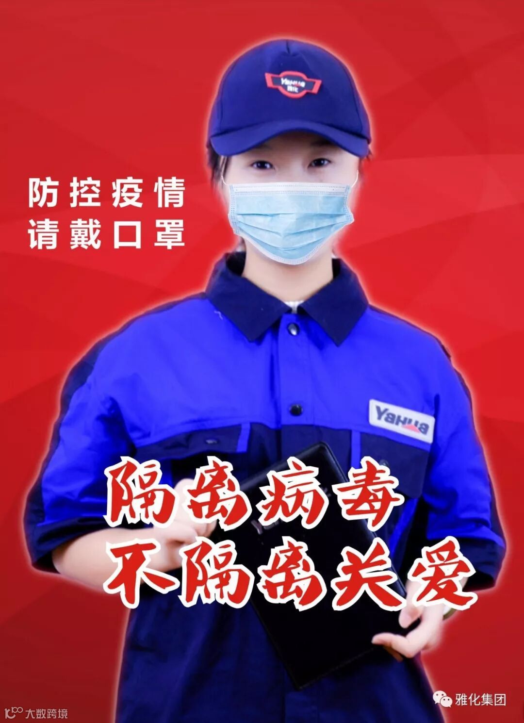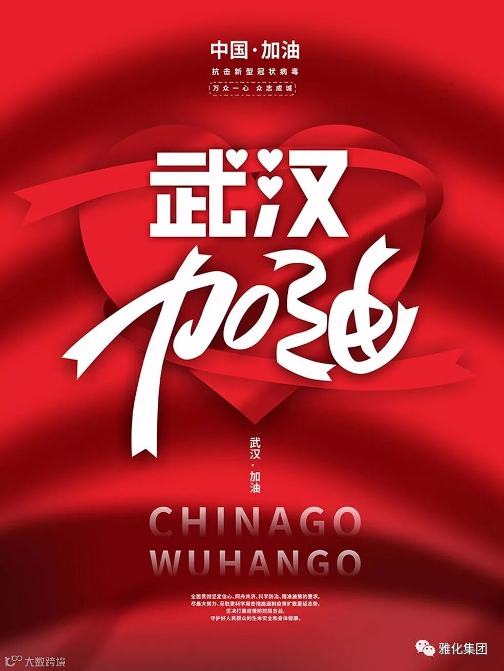 雅化员工们,大家好!2020年一开始,当我们以喜悦的心态迎接新年到来的时候,新冠肺炎这场遭遇战不期而至,面对这场突如其来的疫情,从国家、省、市、县等各级政府都已经积极行动起来了,全力以赴投入疫情防控各项工作。广大医务人员放弃了春节、放弃了假期“逆行“奔赴一线,与病毒抗争、和死神抢人,还有更多的警察、社区工作人员、建筑工人、清洁工人……我们应该向他们致敬!