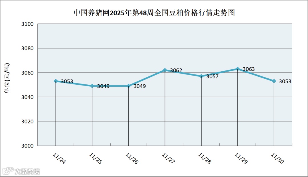 据中国养猪网猪价系统数据监测,2025年第48周(2025年11月24日至2025年11月30日)本周豆粕价格周内呈现窄幅波动态势。全周豆粕价格区间在3049-3063元/吨,周初豆粕价格为3053元/吨,周末价格为3053元/吨,全周豆粕价格累计下跌了0元/吨。