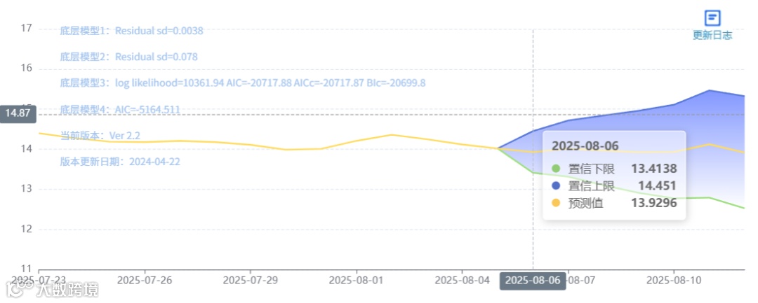 玄田算法是由项目课题组团队原创的非经典逻辑数值聚合理论和不确定性预测方法,构建了基于一致模算子的生猪价格预测模型。该模型采用的聚合函数及一致模相关理论与方法已获得多项国家自然科学基金和省级自然科学资金资助,并获得多项省级自然科学奖奖项。08月06日预测猪价为13.9296,置信区间在13.4138--14.451之间。08月07日预测猪价为14.0127;08月08日预测猪价为14.9703。