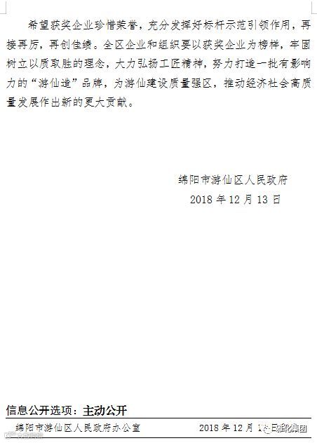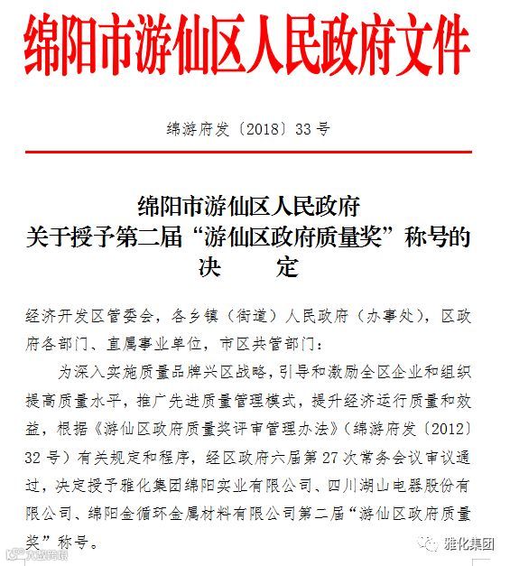 12月13日,绵阳市游仙区区政府绵游府发〔2018〕33号文件《绵阳市游仙区人民政府关于授予第二届“游仙区政府质量奖”称号的决定》,决定授予雅化集团绵阳公司第二届“游仙区政府质量奖”称号。