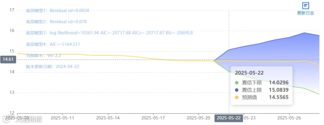 玄田算法是由项目课题组团队原创的非经典逻辑数值聚合理论和不确定性预测方法,构建了基于一致模算子的生猪价格预测模型。该模型采用的聚合函数及一致模相关理论与方法已获得多项国家自然科学基金和省级自然科学资金资助,并获得多项省级自然科学奖奖项。05月22日预测猪价为14.5565,置信区间在14.0296--15.0839之间。05月23日预测猪价为14.5308;05月24日预测猪价为14.4965。