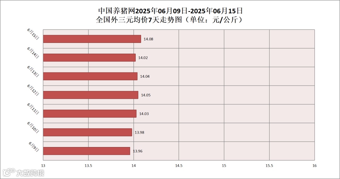 2025年06月15日(星期日),据中国养猪网猪价系统监测,全国外三元均价为14.08元/公斤,猪价较昨日(14.02元/公斤)上涨了0.06元/公斤,较上月(14.80元/公斤)下跌了0.72元/公斤。