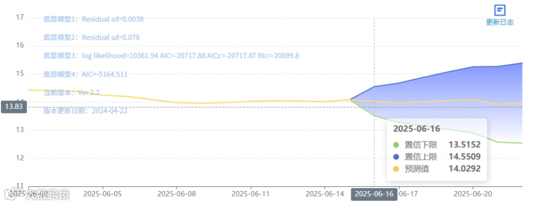 玄田算法是由项目课题组团队原创的非经典逻辑数值聚合理论和不确定性预测方法,构建了基于一致模算子的生猪价格预测模型。该模型采用的聚合函数及一致模相关理论与方法已获得多项国家自然科学基金和省级自然科学资金资助,并获得多项省级自然科学奖奖项。06月16日预测猪价为14.0292,置信区间在13.5152--14.5509之间。06月17日预测猪价为13.9703;06月18日预测猪价为14.0070。