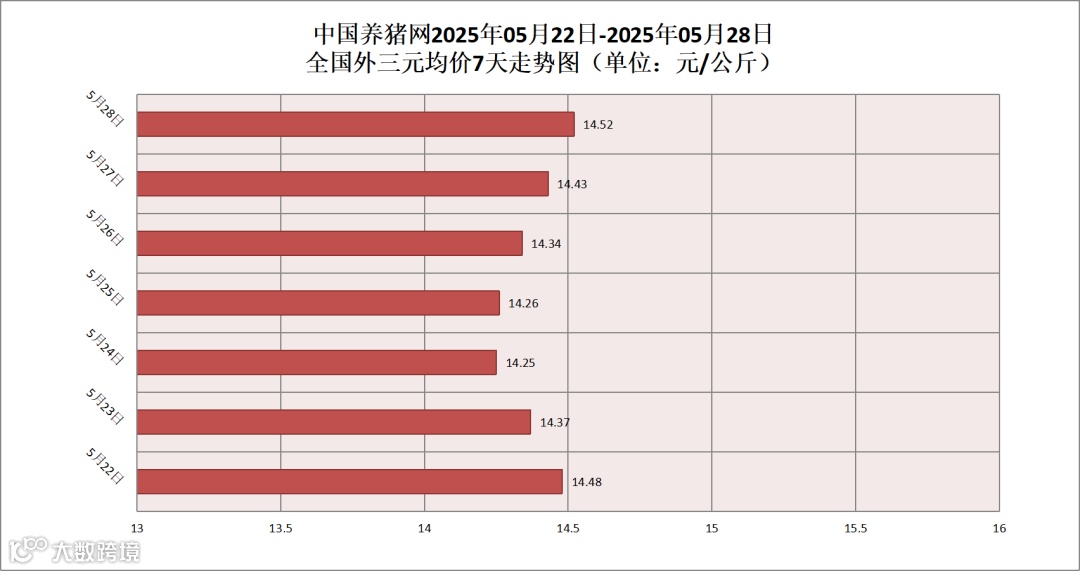 2025年05月28日(星期三),据中国养猪网猪价系统监测,全国外三元均价为14.52元/公斤,猪价较昨日(14.43元/公斤)上涨了0.09元/公斤,较上月(14.86元/公斤)下跌了0.34元/公斤。