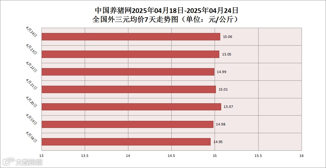 2025年04月24日(星期四),据中国养猪网猪价系统监测,全国外三元均价为15.06元/公斤,猪价较昨日(15.05元/公斤)上涨了0.01元/公斤,较上月(14.65元/公斤)上涨了0.41元/公斤。