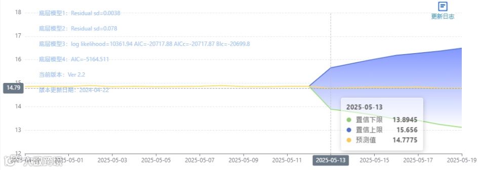 玄田算法是由项目课题组团队原创的非经典逻辑数值聚合理论和不确定性预测方法,构建了基于一致模算子的生猪价格预测模型。该模型采用的聚合函数及一致模相关理论与方法已获得多项国家自然科学基金和省级自然科学资金资助,并获得多项省级自然科学奖奖项。05月13日预测猪价为14.7775,置信区间在13.8945--15.6560之间。05月14日预测猪价为14.8139;05月15日预测猪价为14.8311。