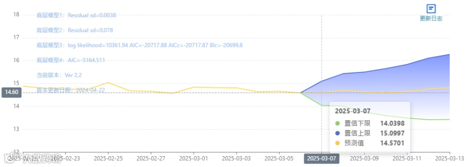 玄田算法是由项目课题组团队原创的非经典逻辑数值聚合理论和不确定性预测方法,构建了基于一致模算子的生猪价格预测模型。该模型采用的聚合函数及一致模相关理论与方法已获得多项国家自然科学基金和省级自然科学资金资助,并获得多项省级自然科学奖奖项。03月11日预测猪价为14.3480,置信区间在13.6484--15.0564之间。03月12日预测猪价为14.2888;03月13日预测猪价为14.3698。