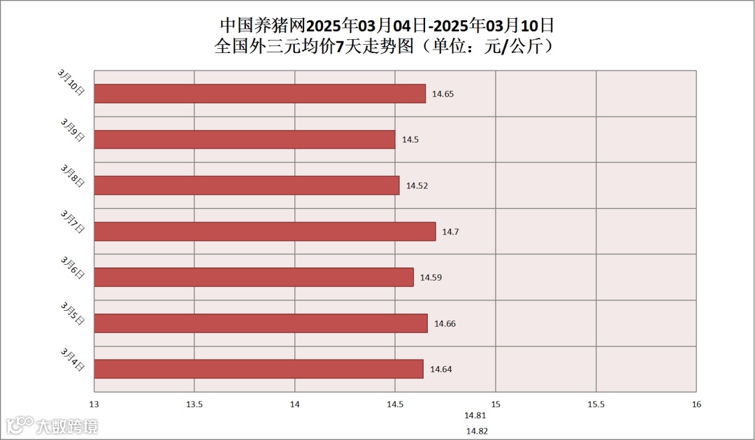 其他生猪品种方面,生猪内三元均价为14.35元/公斤,价格较昨日(14.38元/公斤)下跌了0.03元/公斤;生猪土杂猪均价为14.13元/公斤,价格较昨日(14.13元/公斤)保持平稳。
