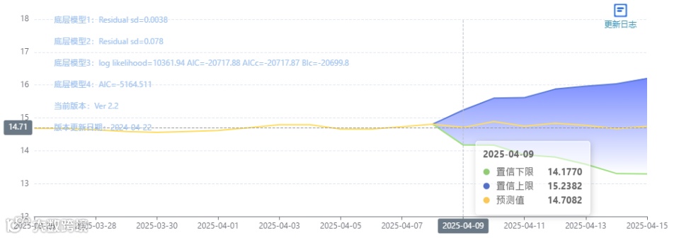 玄田算法是由项目课题组团队原创的非经典逻辑数值聚合理论和不确定性预测方法,构建了基于一致模算子的生猪价格预测模型。该模型采用的聚合函数及一致模相关理论与方法已获得多项国家自然科学基金和省级自然科学资金资助,并获得多项省级自然科学奖奖项。04月09日预测猪价为14.8781,置信区间在13.8455--15.9223之间。04月10日预测猪价为14.8770;04月11日预测猪价为14.9714。