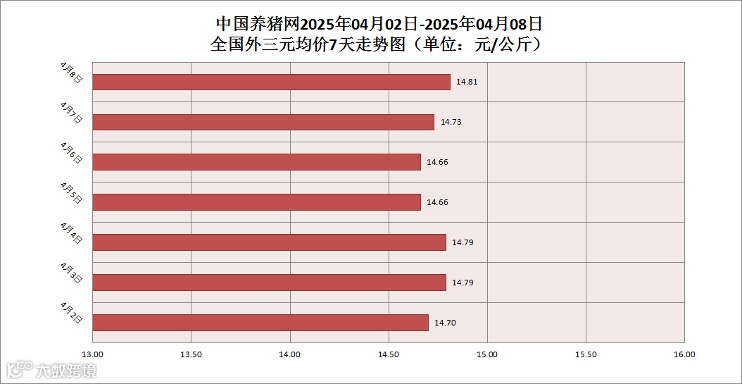 2025年04月08日(星期二),据中国养猪网猪价系统监测,全国外三元均价为14.81元/公斤,猪价较昨日(14.73元/公斤)上涨了0.08元/公斤,较上月(14.52元/公斤)上涨了0.29元/公斤。