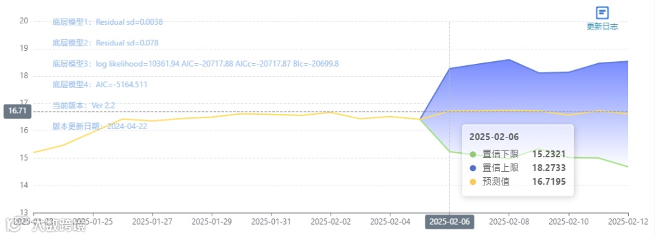 玄田算法是由项目课题组团队原创的非经典逻辑数值聚合理论和不确定性预测方法,构建了基于一致模算子的生猪价格预测模型。该模型采用的聚合函数及一致模相关理论与方法已获得多项国家自然科学基金和省级自然科学资金资助,并获得多项省级自然科学奖奖项。02月07日预测猪价为16.0444,置信区间在15.7254--16.3655之间。02月08日预测猪价为15.9777;02月09日预测猪价为15.9763。