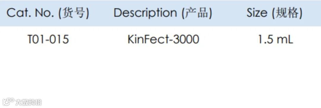 KinFect-3000 转染试剂是一种基于脂质体作为体内和体外输送载体的工具,通过包裹DNA或RNA形成复合物,并导入到各种不同类型的贴壁和悬浮细胞内。KinFect-3000转染试剂提供了出色的转染性能,在面对各种难转染的细胞同样保持高效率的转染效果,以及提高了细胞存活率。