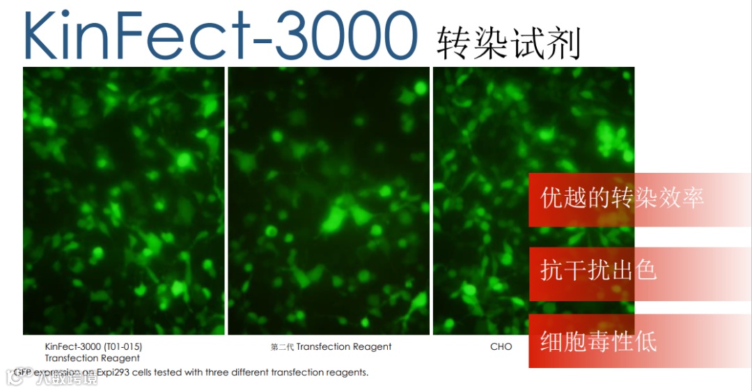 KinFect-3000转染试剂经过与Lipofectamine® 3000 同比测试具有一样出众的转染效果,同样适用于针对血清原代细胞进行DNA和RNA转染。