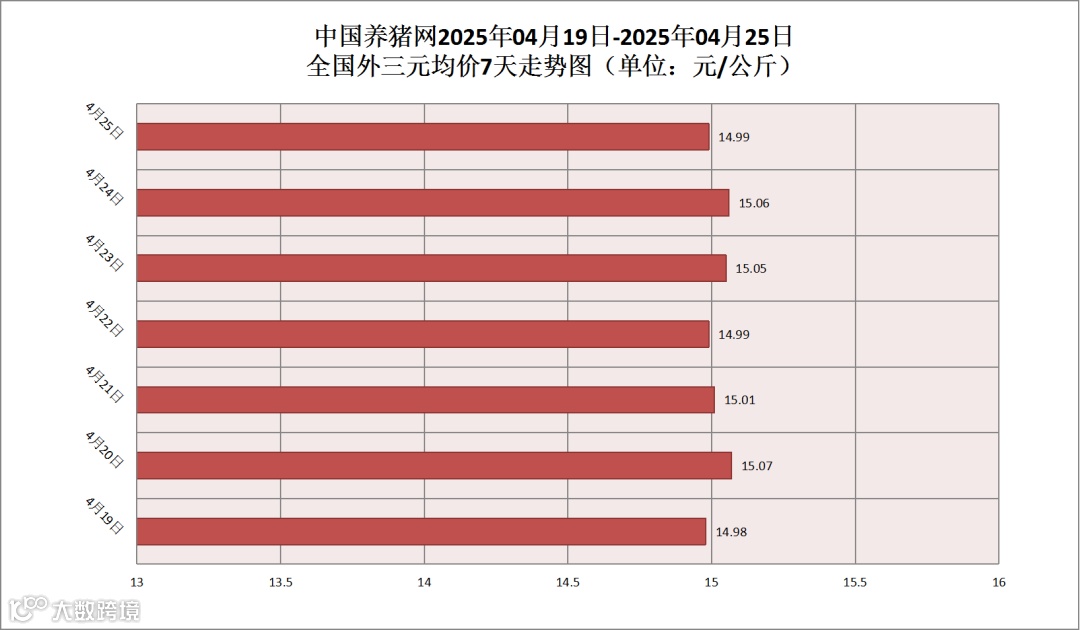 2025年04月25日(星期五),据中国养猪网猪价系统监测,全国外三元均价为14.99元/公斤,猪价较昨日(15.06元/公斤)下跌了0.07元/公斤,较上月(14.68元/公斤)上涨了0.31元/公斤。