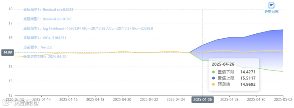 玄田算法是由项目课题组团队原创的非经典逻辑数值聚合理论和不确定性预测方法,构建了基于一致模算子的生猪价格预测模型。该模型采用的聚合函数及一致模相关理论与方法已获得多项国家自然科学基金和省级自然科学资金资助,并获得多项省级自然科学奖奖项。04月26日预测猪价为14.9692,置信区间在14.4271--15.5117之间。04月27日预测猪价为15.1369;04月28日预测猪价为15.1564。