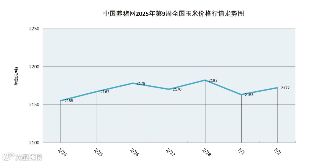 据中国养猪网猪价系统数据监测,2025年第9周(2025年02月24日至2025年03月02日)本周玉米价格走势,周初至周末玉米价格窄幅波动。全周玉米价格区间在2155-2182元/吨之间,周初玉米价格为2155元/吨,周末价格为2172元/吨,全周玉米价格累计上涨了17元/吨。