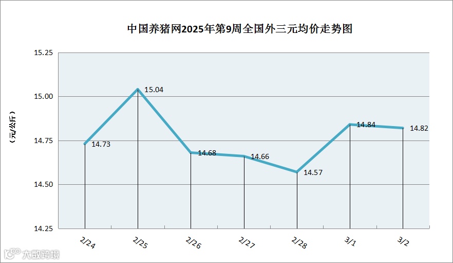 据中国养猪网猪价系统数据监测,2025年第9周(2025年02月24日至2025年03月02日)全国外三元生猪价格周初“过山车”,周中持续小幅下跌,周末涨跌调整,整体区间在14.57-15.04元/公斤之间!周初猪价为14.73元/公斤,周末猪价为14.82元/公斤,全周猪价累计上涨了0.09元/公斤。