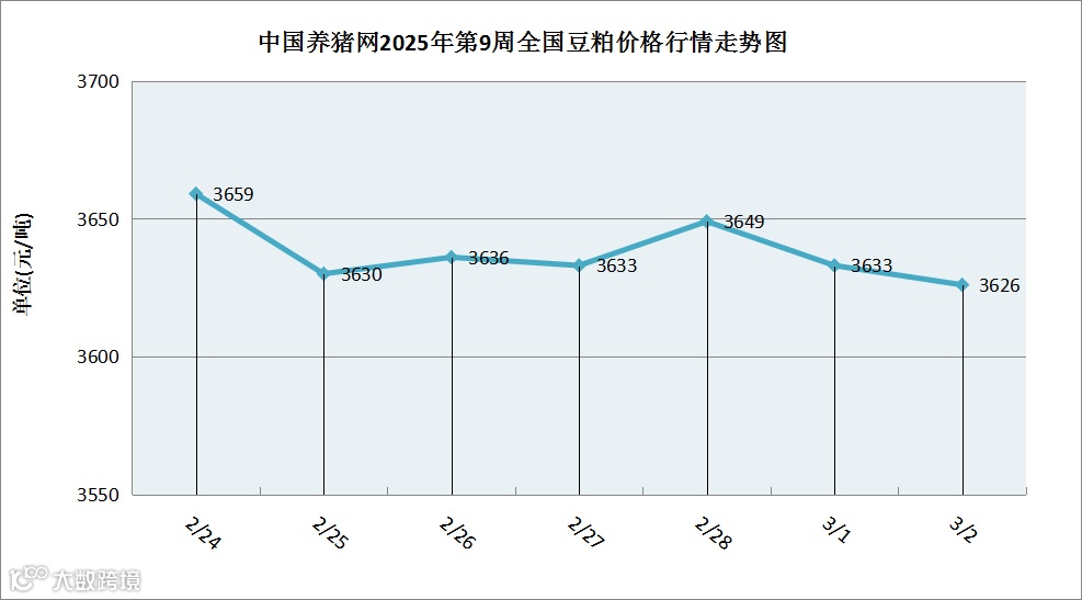 据中国养猪网猪价系统数据监测,2025年第9周(2025年02月24日至2025年03月02日)本周豆粕价格周初至周中小幅涨跌调整,周中至周末直线下跌。全周豆粕价格区间在3626-3659元/吨,周初豆粕价格为3659元/吨,周末价格为3626元/吨,全周豆粕价格累计下跌了33元/吨。