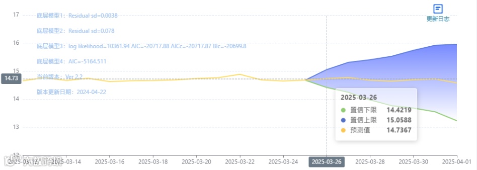 玄田算法是由项目课题组团队原创的非经典逻辑数值聚合理论和不确定性预测方法,构建了基于一致模算子的生猪价格预测模型。该模型采用的聚合函数及一致模相关理论与方法已获得多项国家自然科学基金和省级自然科学资金资助,并获得多项省级自然科学奖奖项。03月26日预测猪价为14.7367,置信区间在14.4219--15.0588之间。03月27日预测猪价为14.7743;03月28日预测猪价为14.6822。