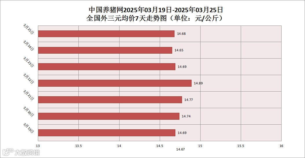 2025年03月25日(星期二),据中国养猪网猪价系统监测,全国外三元均价为14.68元/公斤,猪价较昨日(14.65元/公斤)上涨了0.03元/公斤,较上月(14.79元/公斤)下跌了0.11元/公斤。