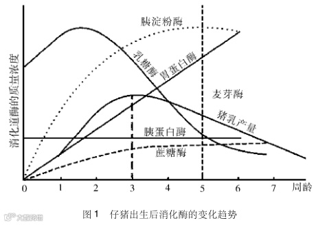 快。许多研究表明:仔猪断奶后消化系统可发生显著变化:主要表现为小肠出现严重的绒毛萎缩、腺窝变深、吸收障碍、肠黏膜淋巴细胞增生和隐窝细胞有丝分裂速度加快。消化系统发育不完善,需要补充内源酶,如:蛋白酶和糖类酶。另外,由于断奶应激造成消化系统素乱,消化酶分泌不足。