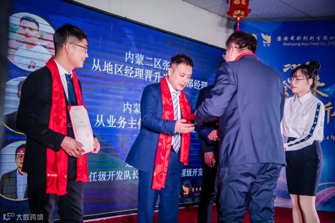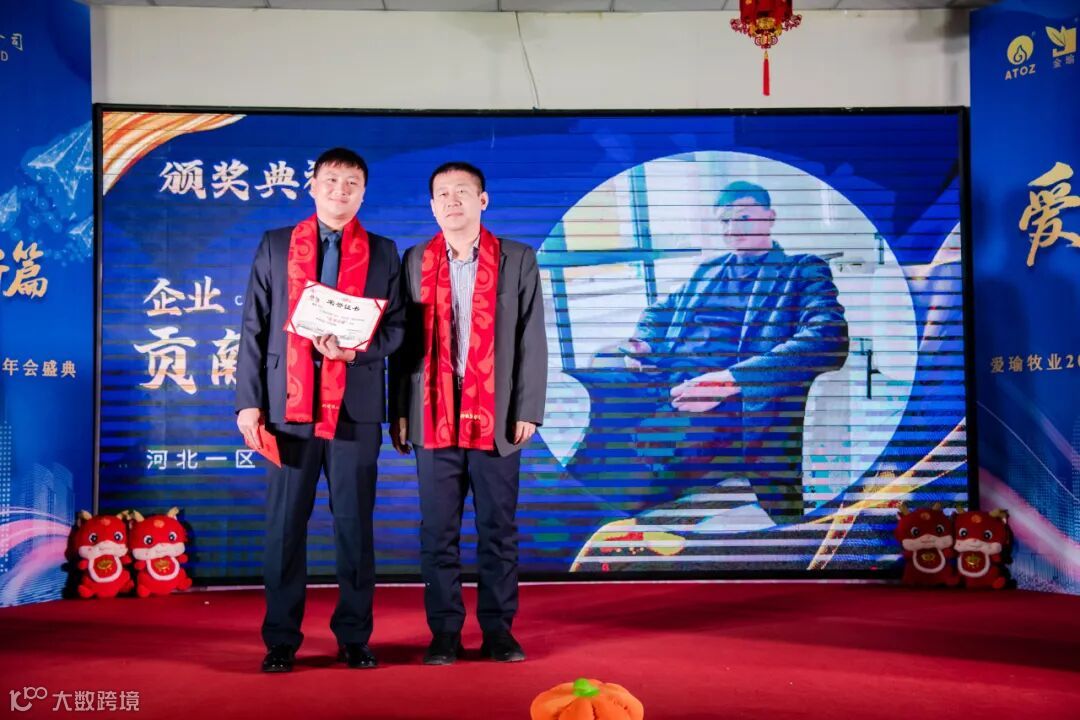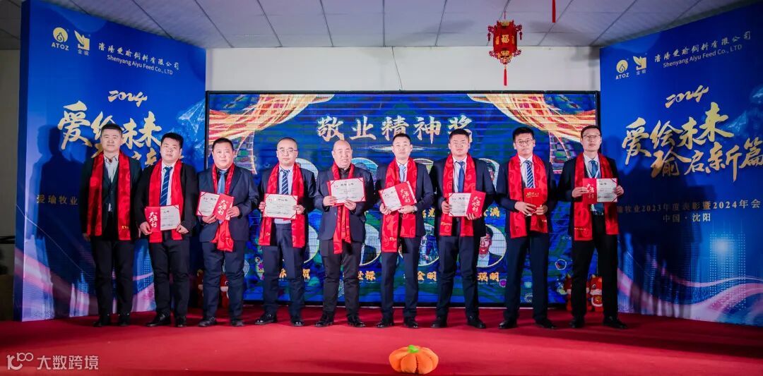 获得敬业精神奖的是:市场策划部反刍技术服务陈爽老师;辽宁区薛祥老师;内蒙一区朱德光经理;河北二区王金满经理;阜新区张金贺经理;开发队宿仕禄经理;市场策划部杨金明经理;市场策划部于瑞明经理。爱瑜牧业销售总经理高升为其颁奖。