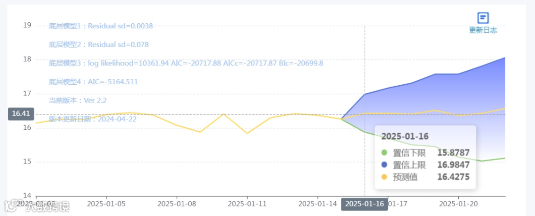 玄田算法是由项目课题组团队原创的非经典逻辑数值聚合理论和不确定性预测方法,构建了基于一致模算子的生猪价格预测模型。该模型采用的聚合函数及一致模相关理论与方法已获得多项国家自然科学基金和省级自然科学资金资助,并获得多项省级自然科学奖奖项。01月16日预测猪价为16.4275,置信区间在15.8787--16.9847之间。01月17日预测猪价为16.4324;01月18日预测猪价为16.4057。