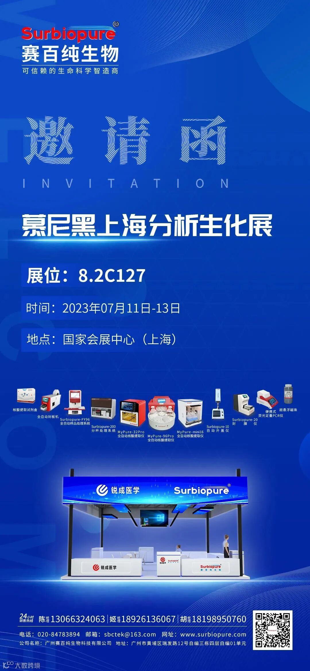 届时广州赛百纯生物科技有限公司将携全自动核酸提取仪系列、核酸提取试剂盒系列等相关配套产品于展位号:8.2C127亮相,我们诚挚邀请您的到来!七月盛夏!属于我们的狂欢时刻即将来袭!让我们相约一起共赴盛会吧!
